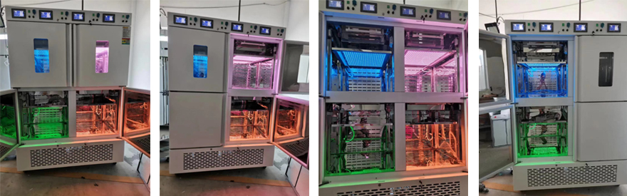 此箱體是植物光反應(yīng),光合作用研究的專業(yè)箱體。光合作用中植物對(duì)各種波長(zhǎng)的光都能吸收,但吸收較多的是紅光和藍(lán)紫光。此箱體光源采用先進(jìn)的冷光源紅光、藍(lán)紫光、白光。